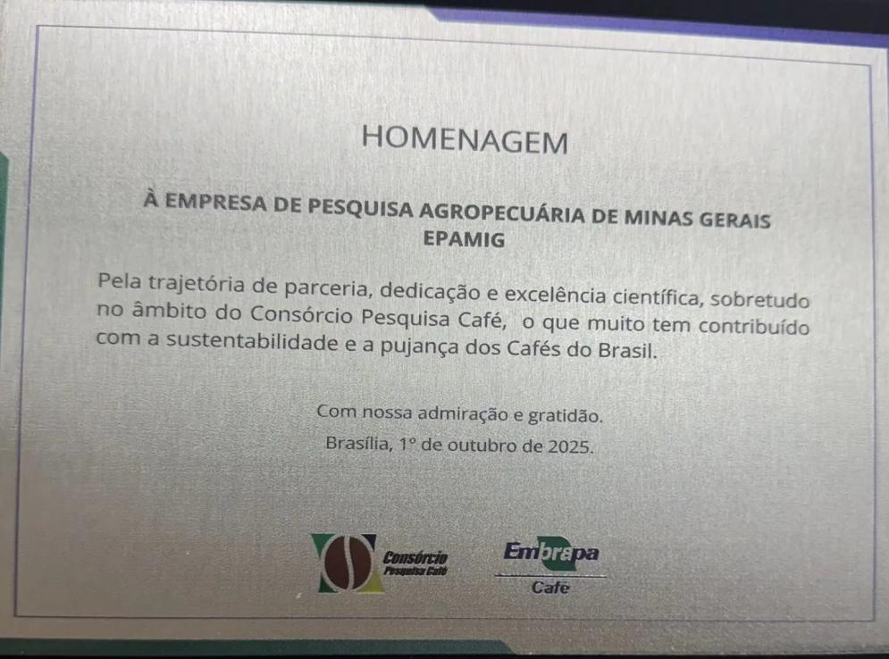 (Brasília – 1/10/2025) A Empresa de Pesquisa Agropecuária de Minas Gerais (EPAMIG) participou nesta quarta-feira, 1 de outubro, em Brasília, da solenidade comemorativa aos 25 anos Embrapa Café. Na ocasião, a instituição mineira foi homenageada por sua contribuição na consolidação do Consórcio Pesquisa Café.