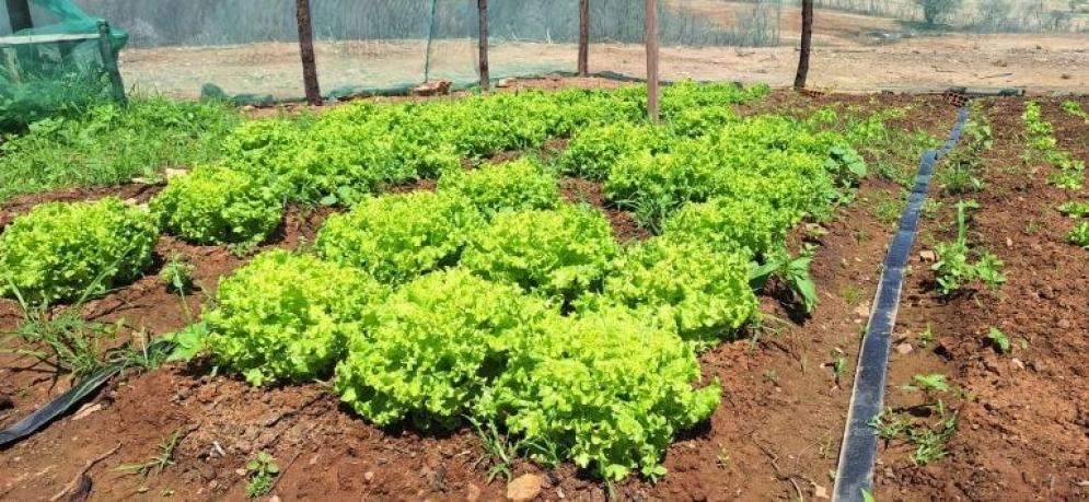 Utilizando água de poço tubular e de açude existentes na propriedade para a irrigação, localizada, por micro aspersão usando mangueira perfurada, o agricultor familiar produz hortaliças folhosas, como coentro, alface, cebolinha e couve. Para proteção da luz solar excessiva, ele passou a usar tela de sombreamento, obtendo bons resultados.